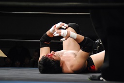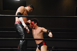 しかしFUMAはいきなりの顔面ビッグブーツ(右写真)、場外戦に。FUMA客席に振ろうとするが石川切り返す。石川鉄柱攻撃、リングに戻す。