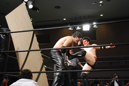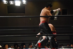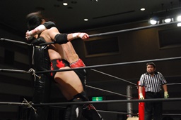 コーナーに上るがFUMA起き上がってチョップ(左写真)。
