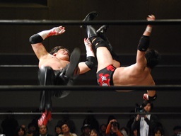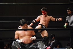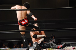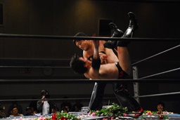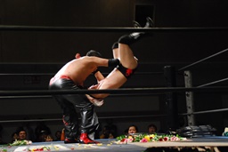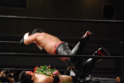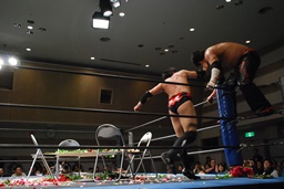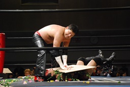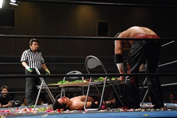 FUMAはエルボーで石川を場外に落とすと体に花輪を巻きつけて、イスを踏み台に(右写真)、