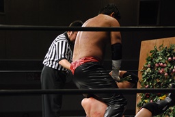 リングに戻るとジャンピングハイキック(左写真)、カウント2。