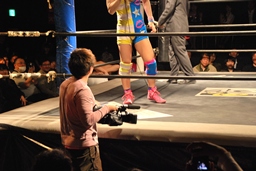 カメラ持ったままリングサイドに(右写真)。「フェイク」という言葉を繰り返す。