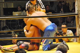SAKAMOTOコブラツイストに捕らえ脇腹にパンチ(左写真)。