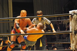 田中垂直落下式ブレーンバスター(左写真)、カウント2。田中ロープに飛んでスライディングD、カウント3。