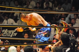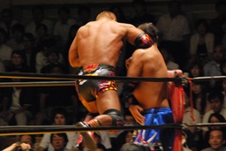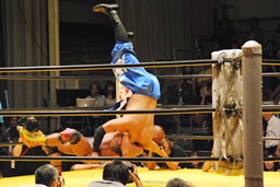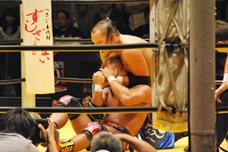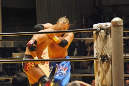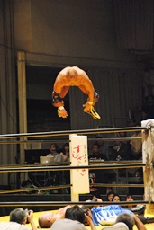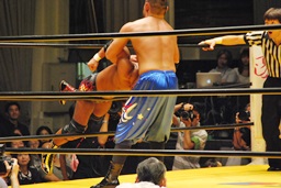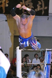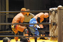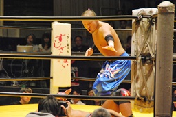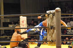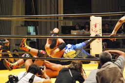 田中はリングサイドにテーブルをセット、SAKAMOTOを寝せるとコーナーに上ってスプラッシュ狙うが(右写真)SAKAMOTO逃げる。田中場外に下りる。