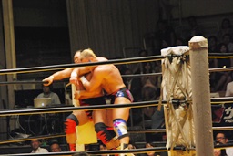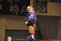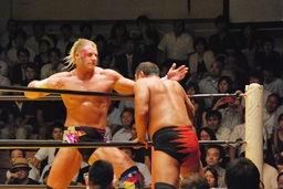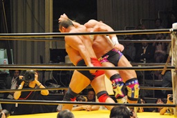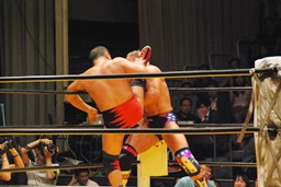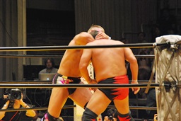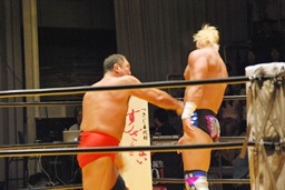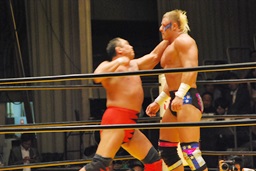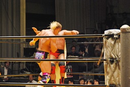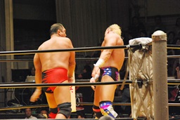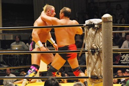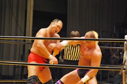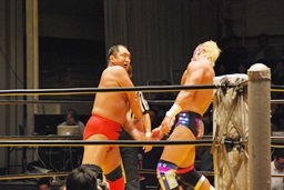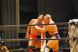 大谷ヘッドロック、ライディーンロープに振ろうとするが大谷振らせない。ようやくロープに振ってショルダーブロックの打ち合い、ライディーンの勝ち(左写真)。ライディーンギロチンドロップ。首投げからスリーパー、大谷ロープ。手四つから力比べ、ライディーン勝ってボディスラムからエルボードロップ、カウント2。5分経過。