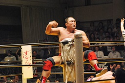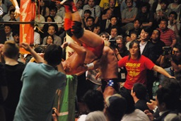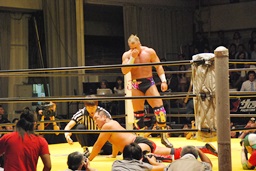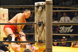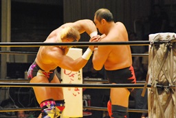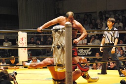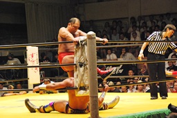 大谷足すくって片逆エビ(右写真)、ライディーンロープ。大谷ストンピング、首投げからチンロック。
