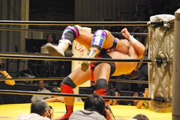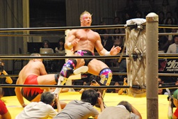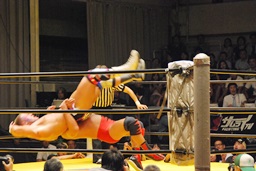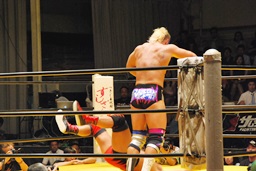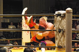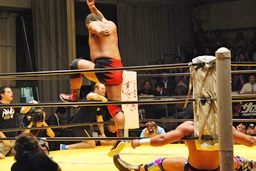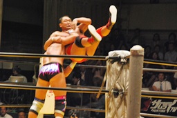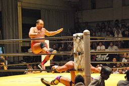 大谷コーナーに上ってミサイルキック(右写真)。