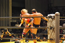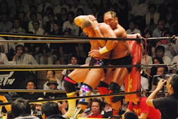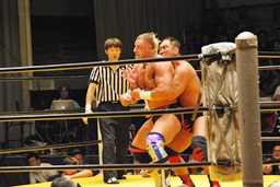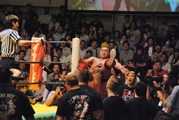 さらにチョークスラム(右写真)、カウント2。10分経過。