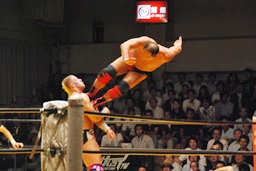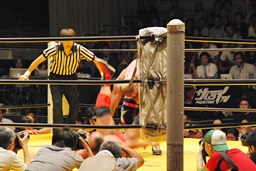 大谷鉄柱に振る、ライディーン切り返して大谷が激突。ライディーン場外でパワーボム狙う(左写真)、