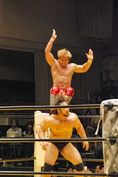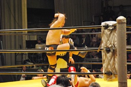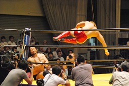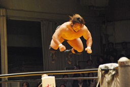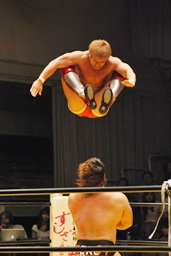 関本ボディスラム、コーナーに上ってフロッグスプラッシュ(左写真)、カウント2。