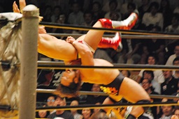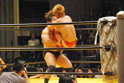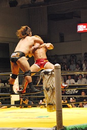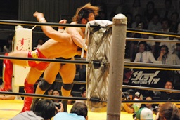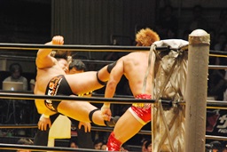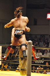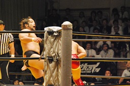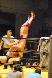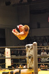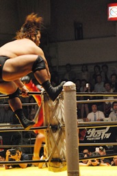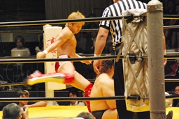 コーナーに上ってミサイルキック(左写真)、カウント2。