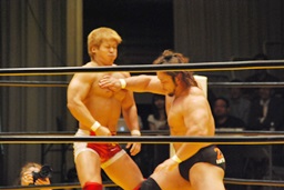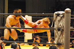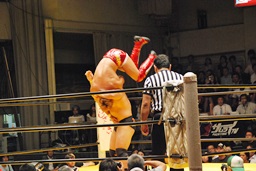 小幡ゴング前にドロップキックで先制、テキサスコンドルキック(右写真)。