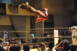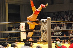 コーナーに上って後頭部にミサイルキック(左写真)、カウント2。