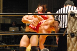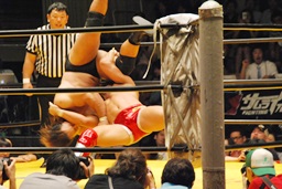 ブレーンバスター、小幡空中で身を翻して着地(右写真)、バック取る、