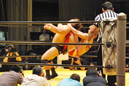 関本ガットショット、ボディスラム、カウント2。スリーパー、小幡ロープ。関本エルボードロップ(右写真)、カウント2。