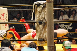 関本延髄蹴り、小幡かわして逆に延髄蹴り(左写真)、RKO、カウント2。15分経過。
