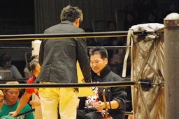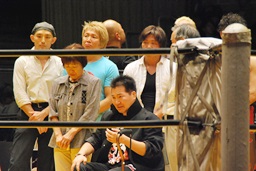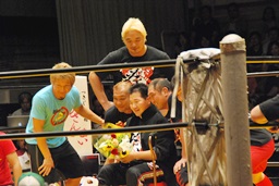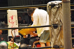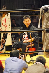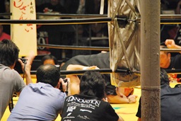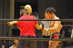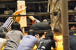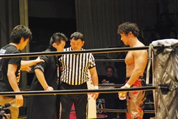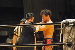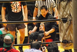 高岩竜一も見つめる中(左写真)「シングルマッチ、30分1本勝負を行います。」と試合開始が告げられる。