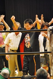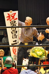 何年かぶりにリングに立ってコールを受け、紙テープを浴びる星川(右写真)