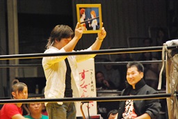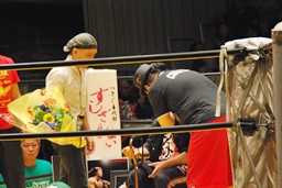 ここでご両親にもリングに上がってもらって星川からのメッセージを沖田リングアナが代読する(左写真)。