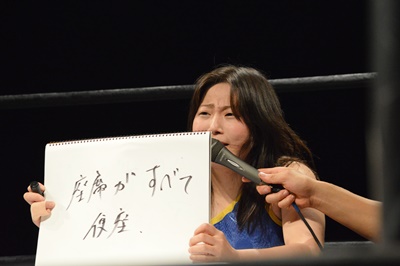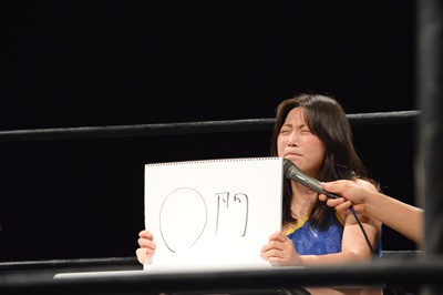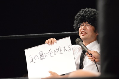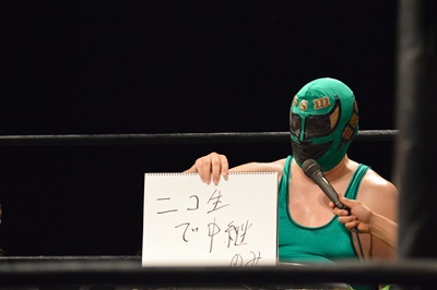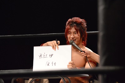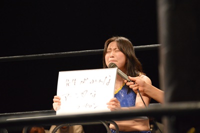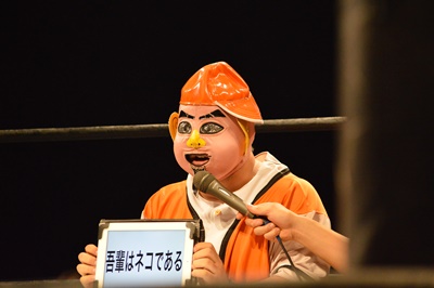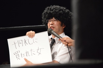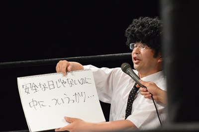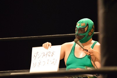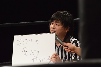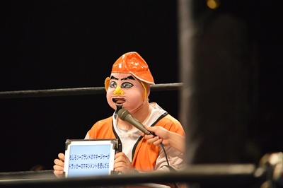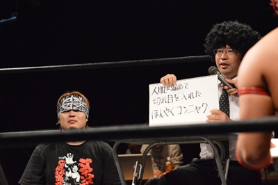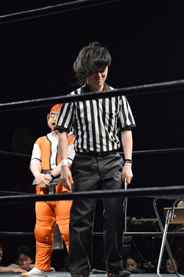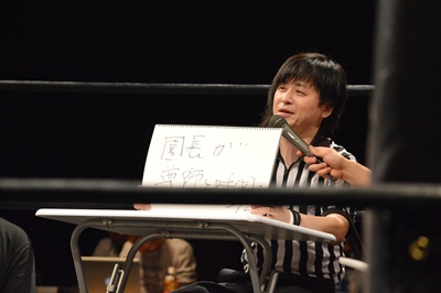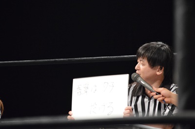 木曽レフェリー(左写真)。試合裁きながらお題が出たら大喜利に挑戦。
