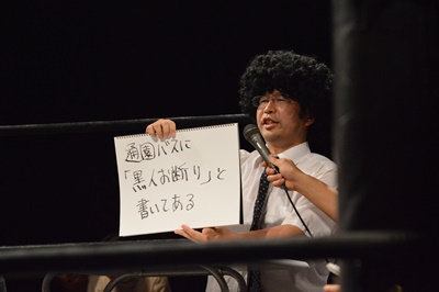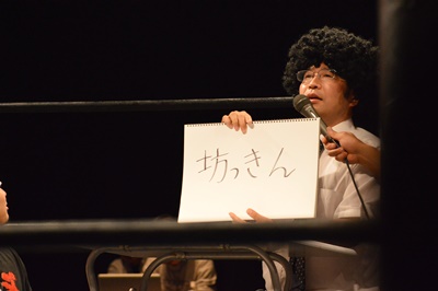 鶴見亜門GM(左写真)。本部席から大喜利に参加。