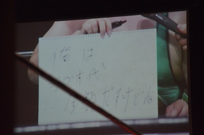 菊タローはスケッチブックではなくタブレットで回答(右写真)。「夜のムード盛り上げ楽団」