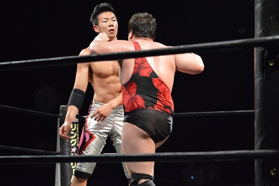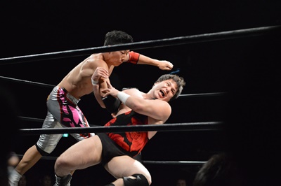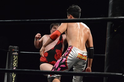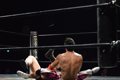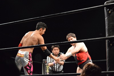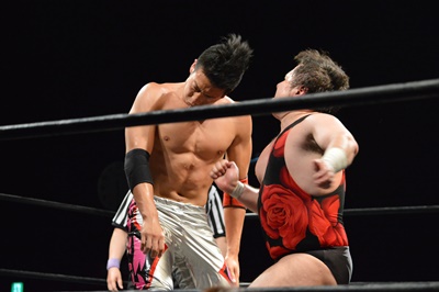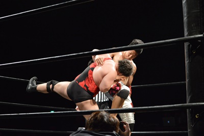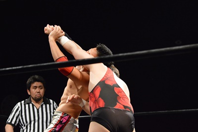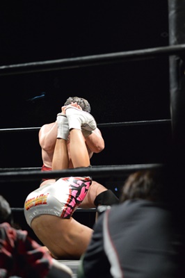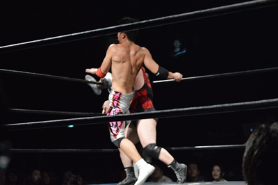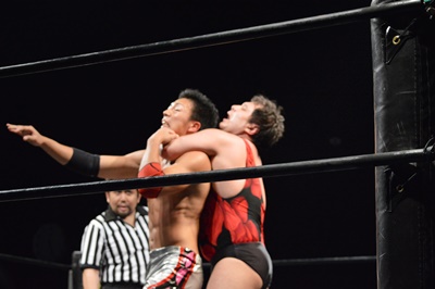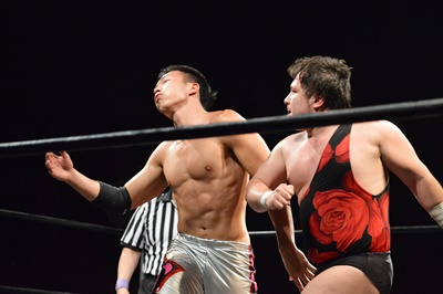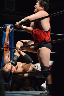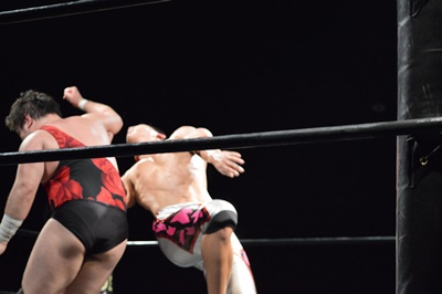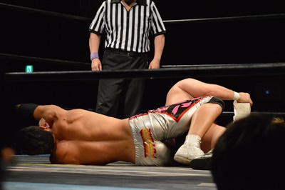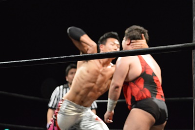 竹下シャープシューター(右写真)、アントンロープ。アントンすぐに立ち上がれずダウンカウント入る、6で立ち上がる。