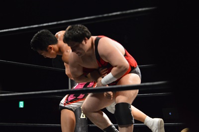 竹下ブルーサンダー狙う、アントンブロック、ロープに飛ぶ、竹下バックエルボー。竹下ロープに飛ぶ、アントンテーズプレス(左写真)からフォアアームドロップ。15分経過。