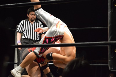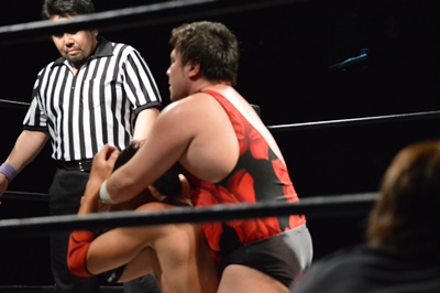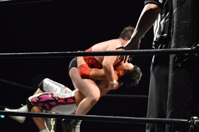 アントン飛行機投げ(右写真)、首投げからスリーパー、立ち上がってフライングメイヤー、竹下エビ固めに、ノーカウント。竹下カニばさみで倒してフェースロック。