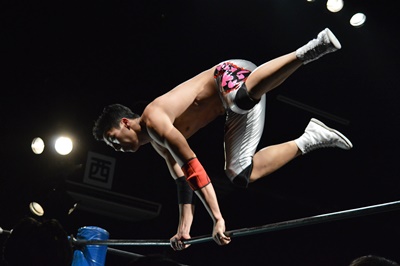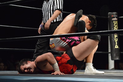 卍固め(右写真)は崩れるが竹下ダウン取られる。カウント8。