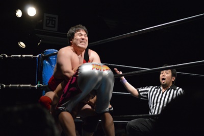 竹下リングに入れてスナップスープレックス(左写真)、カウントは入らず。5分経過。