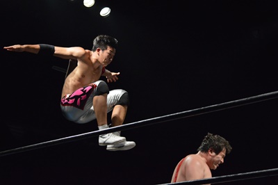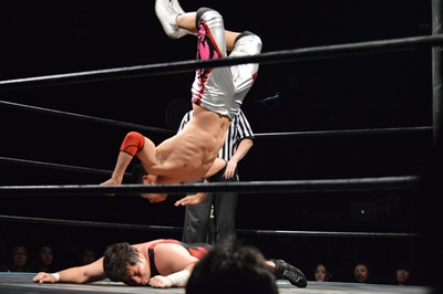 竹下ストンピング、アントンの背中にその場跳びムーンサルトプレス(右写真)。