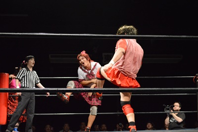 先発はジャイ子とそうまこ。ジャイ子ガットショット(左写真)、ロープに飛ぶ、そうまこドロップキック。