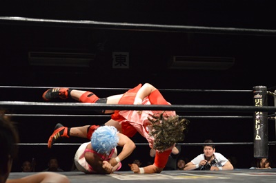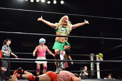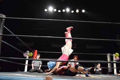 KEIKOとそうまこが入りフラップジャック式ボディプレス(左写真)、晴子がカット。