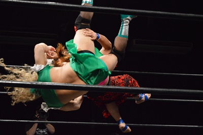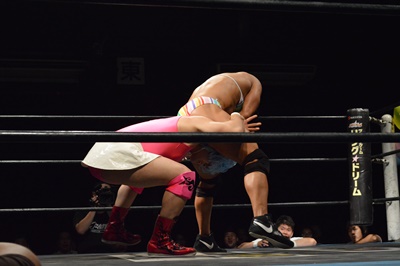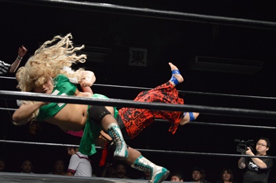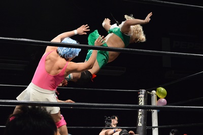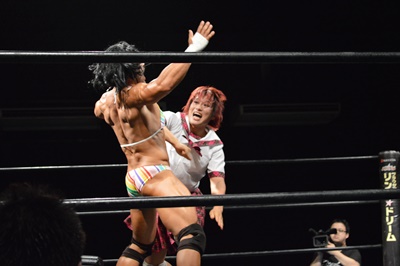 KEIKOジャパニーズオーシャン・サイクロンスープレックス狙う(左写真)、晴子ブロック。
