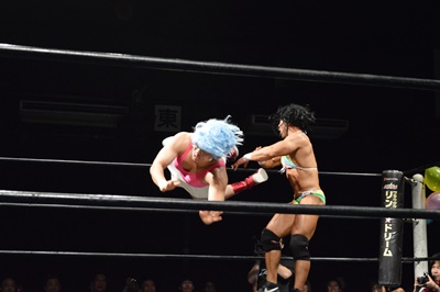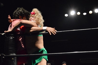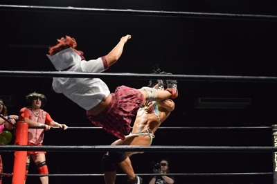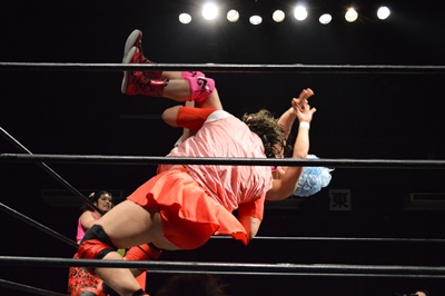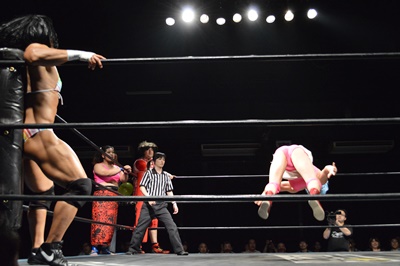 ジャイ子ラリアット、カウント2。チョークスラムに行くがKEIKOはホイップ(右写真)、ドロップキック、シゲコにタッチ。