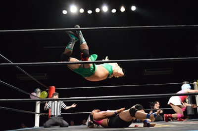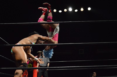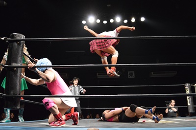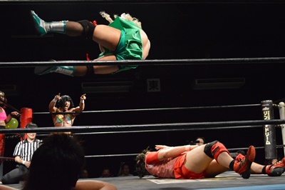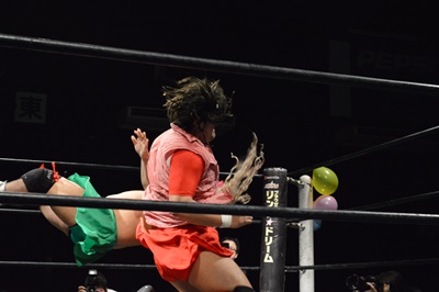 晴子切り返して突っ込む、そうまこカウンターのキック、コーナーに上ってミサイルキック(右写真)、KEIKOにタッチ。
