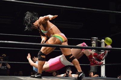 ボディスラム、コーナーに上ってダイビングエルボードロップ(右写真)、カウント2。