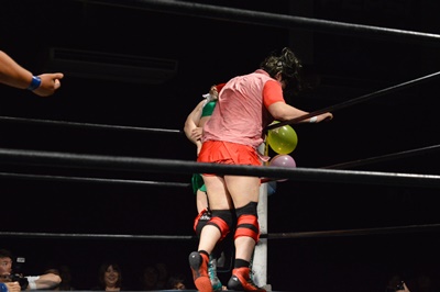 KEIKOコーナーに上る、晴子立ち上がってパンチ、デッドリードライヴ(右写真)。