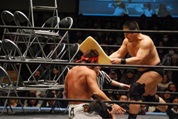 マイケルが用意した第2の公認凶器のし餅を高木が奪い取ってマイケルの背中に一撃(左写真)、餅乗せてカバー、カウント2。