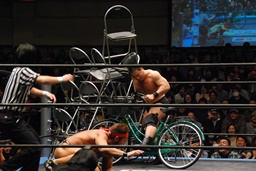 高木が第3の公認凶器・自転車でマイケルを轢く(右写真)、そのまま車輪でカバー、カウント2。