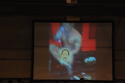 高木がコブラツイスト(左写真)。スクリーンにはマイケルが用意した「高木三四郎が一番嫌がる凶器」。そして「風になれ」が流れる。え、まさか?