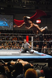 マイケルは高木をネバネバボードに押し付け、アンダータイツを取り出すとコーナーに上ってアルティメットべノムこけし(右写真)、高木かわす。
