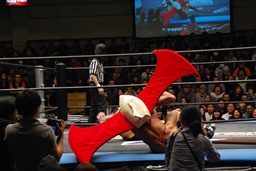 マイケルは高木をリングサイドのテーブルにセットすると6番目の公認凶器・ジェットスクランダーを装着してダイブ。本当に空飛んでるように見える(左写真)。テーブル見事にクラッシュ。マイケルは高木をリングに戻す。
