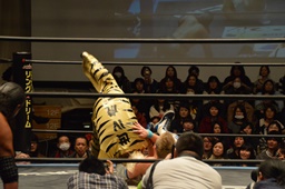世W虎ヘッドバット、セカンドコーナーからダイビングセントーン(左写真)、カウント3。