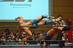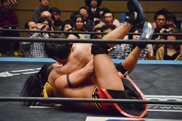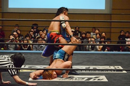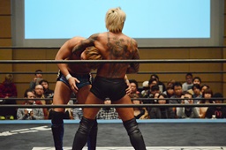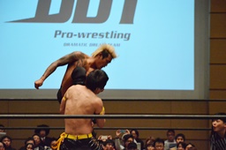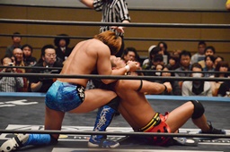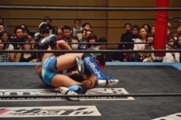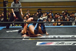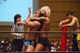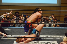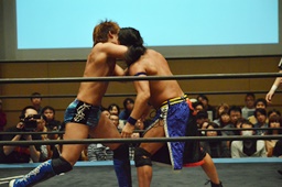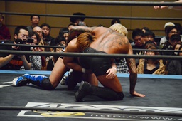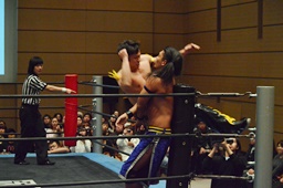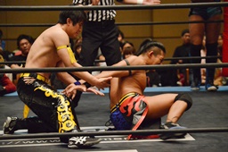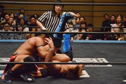 KUDO足を掛けて倒すとケサ固め(左写真)、彰人エビ固めに、カウント1。両者立ち上がる。彰人切り返してヘッドロックからフライングメイヤー、KUDOヘッドシザーズでブレーク。両軍タッチ。