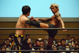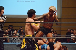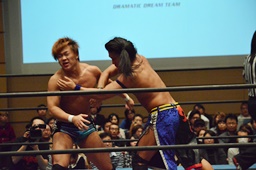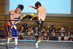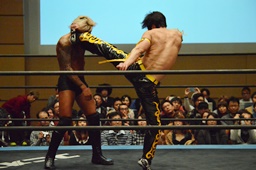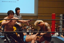 彰人ネックブリーカードロップ、カウント2。遠藤アームホイップ(右写真)、ボディスラムからストンピング。KUDOにタッチ。