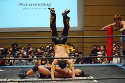 KUDOヒザ蹴り、ボディスラムから倒立式ダブルニードロップ(右写真)、カウント2。