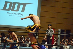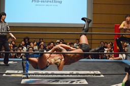 遠藤コーナーに振る、彰人切り返す、遠藤はムーンサルトからの(左写真)リバースDDT、カウント2。