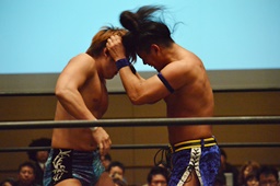 先発はKUDOと彰人。KUDOローキック、バック取る(右写真)、彰人腕を取って切り返す。